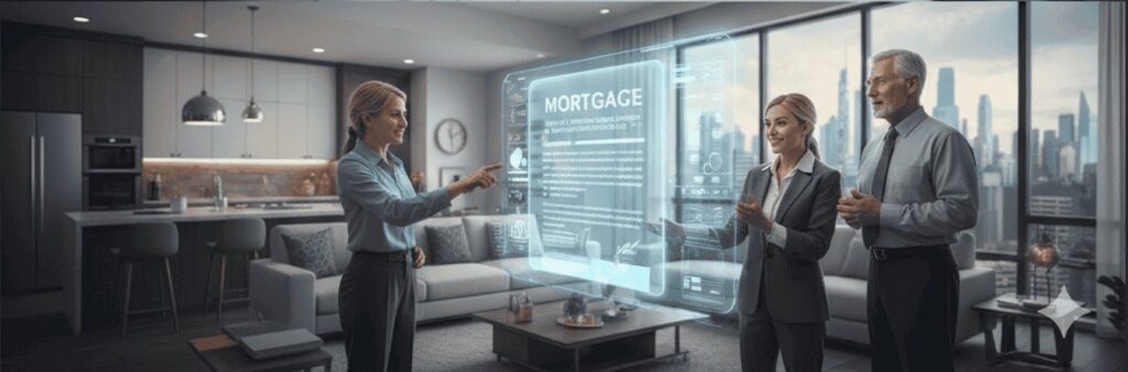 Three people in a living room looking at a projected image of a mortgage.