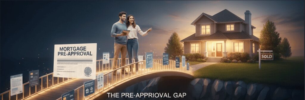A young couple crosses a glowing bridge filled with mortgage documents over a canyon labeled “The Pre-Approval Gap” toward a suburban home.