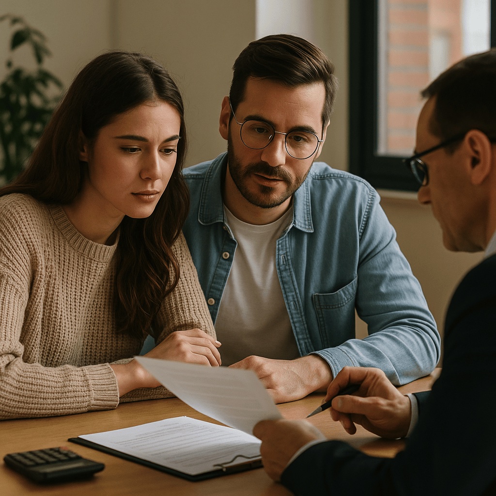 Alt Text: young couple in Utah meeting with a mortgage lender to review home loan interest rates today